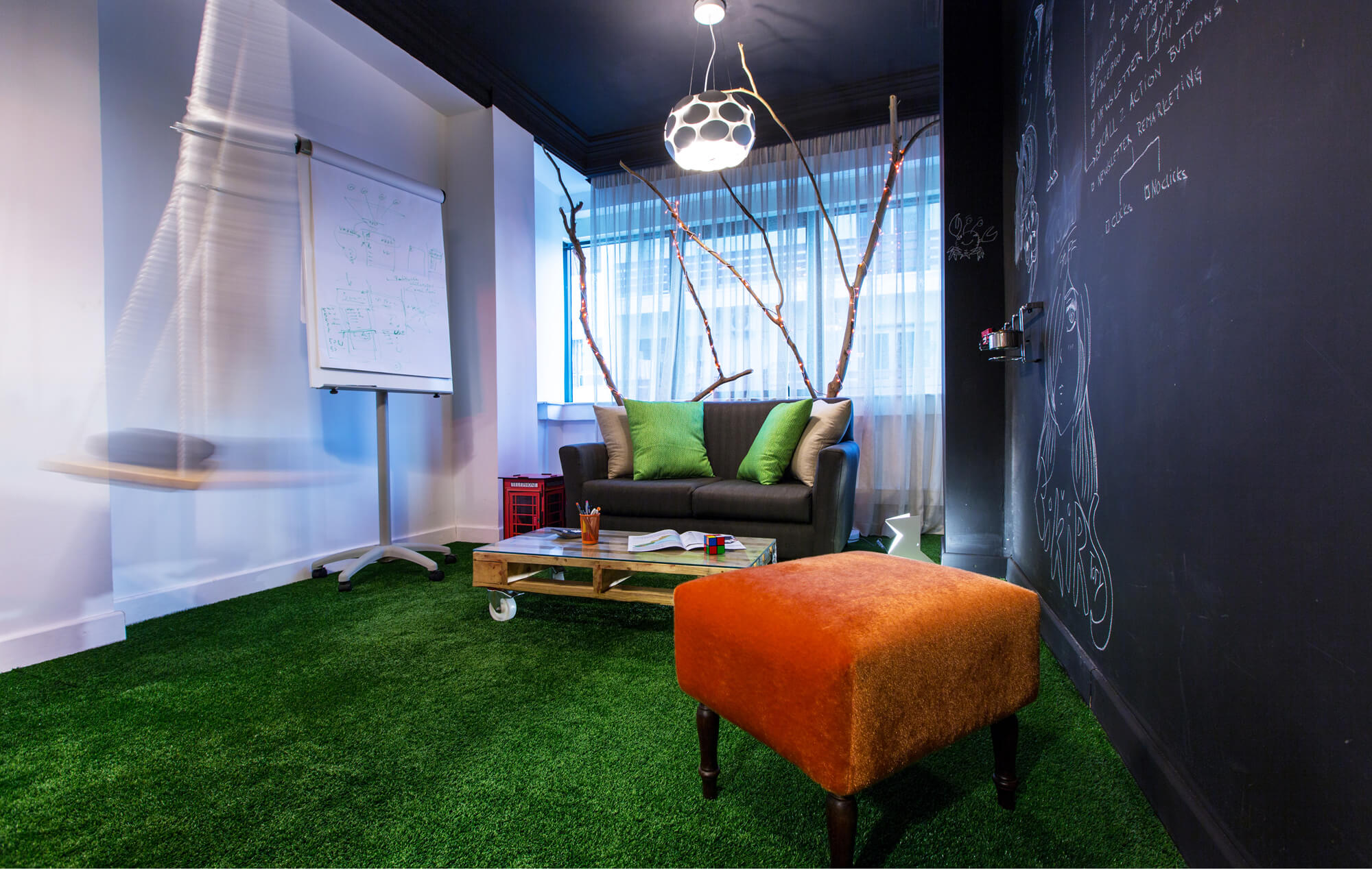 The architect and designer has made out of its 3,230 square feet space a great place to work in Morocco with green grass ground and woodish office tables as well as separate cosy hut-meeting-rooms with a swing and a fully equipped kitchen.