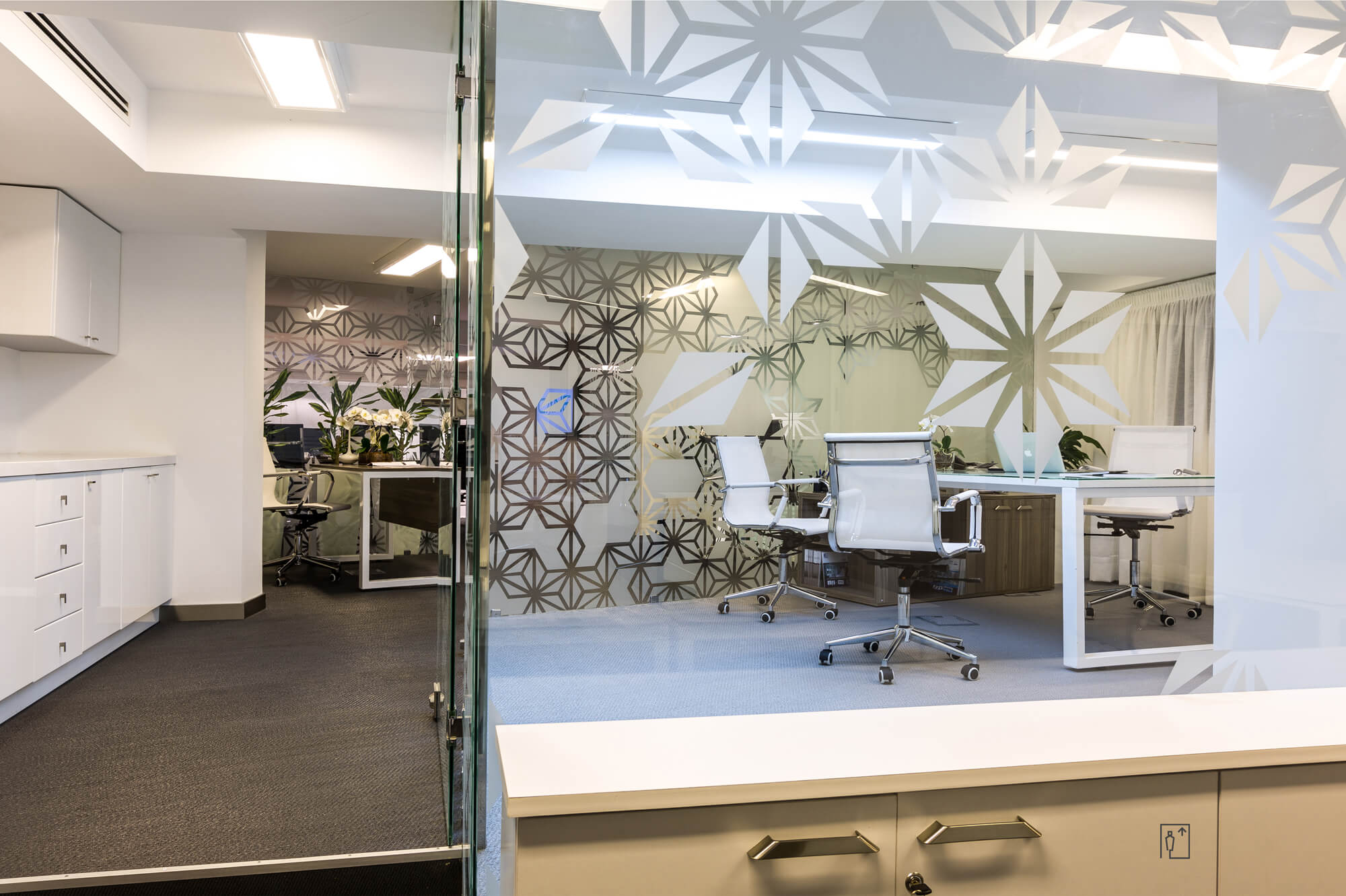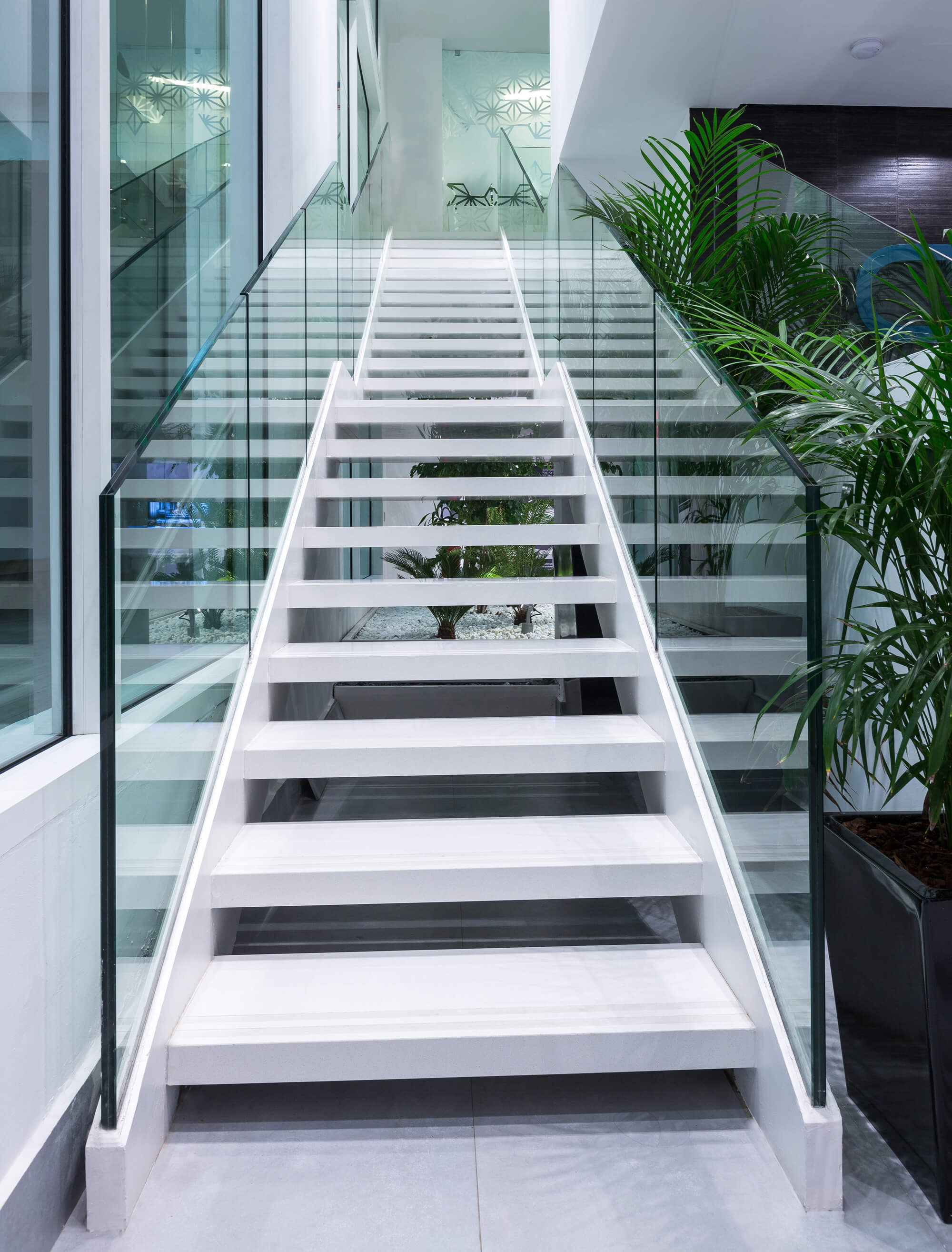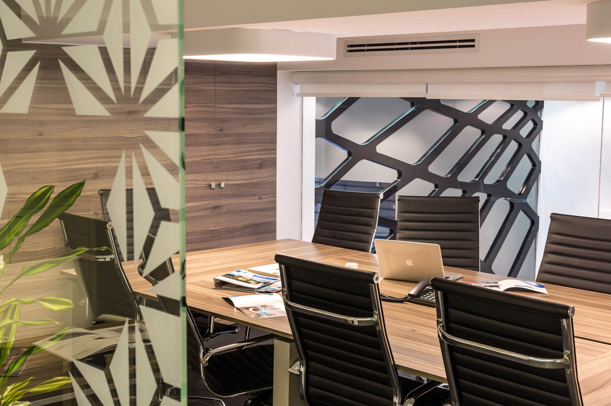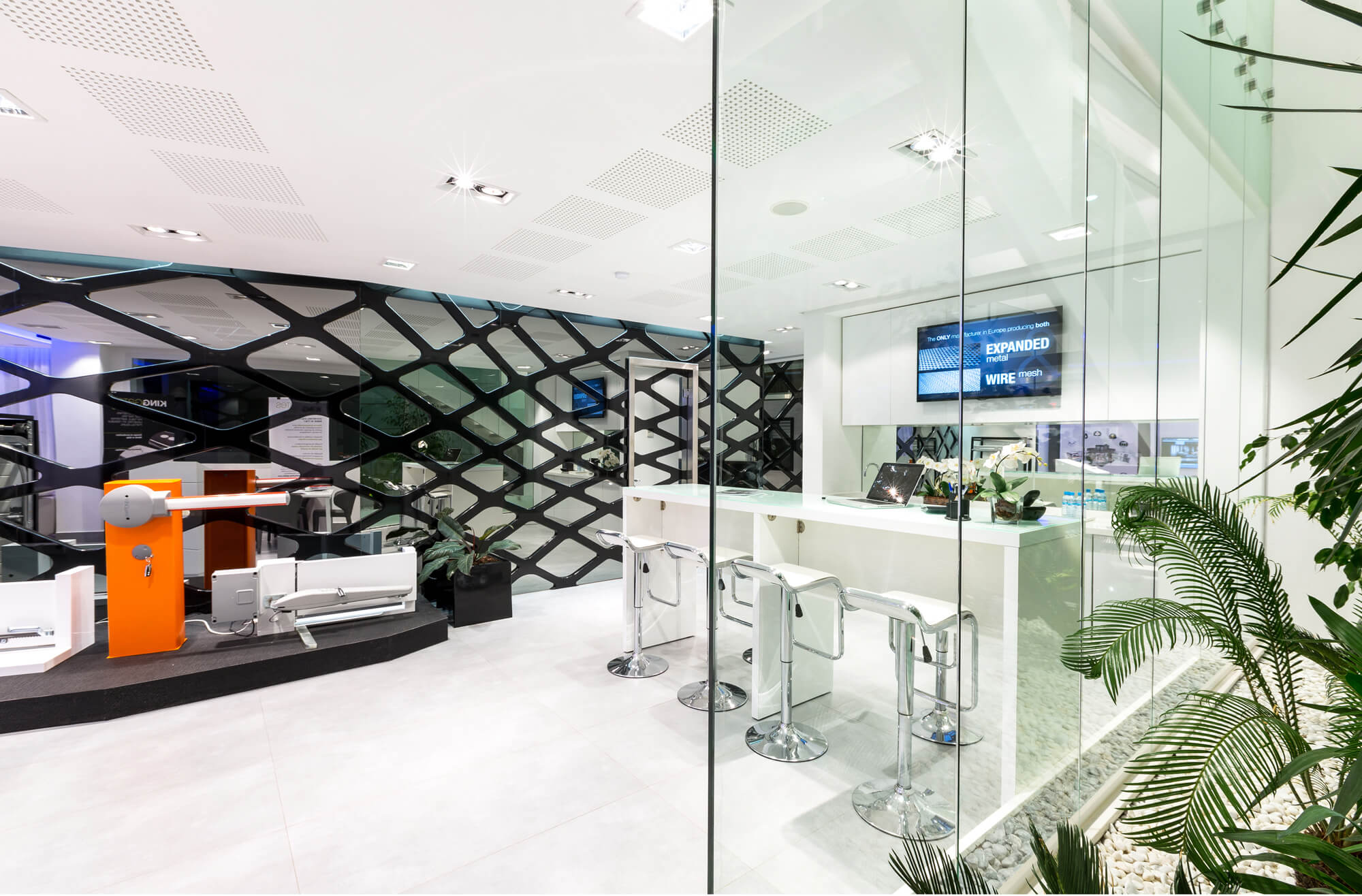 The glass element has been thought of as a unifying thread through the various spaces: sometimes treated as a reflector of light by the monumental musharabieh woven with mirrors, sometimes as a protective screen of a haven of greenery or as a link between the ground and mezzanine levels. The principle is based on the idea of unity and union reflecting the culture of the company.