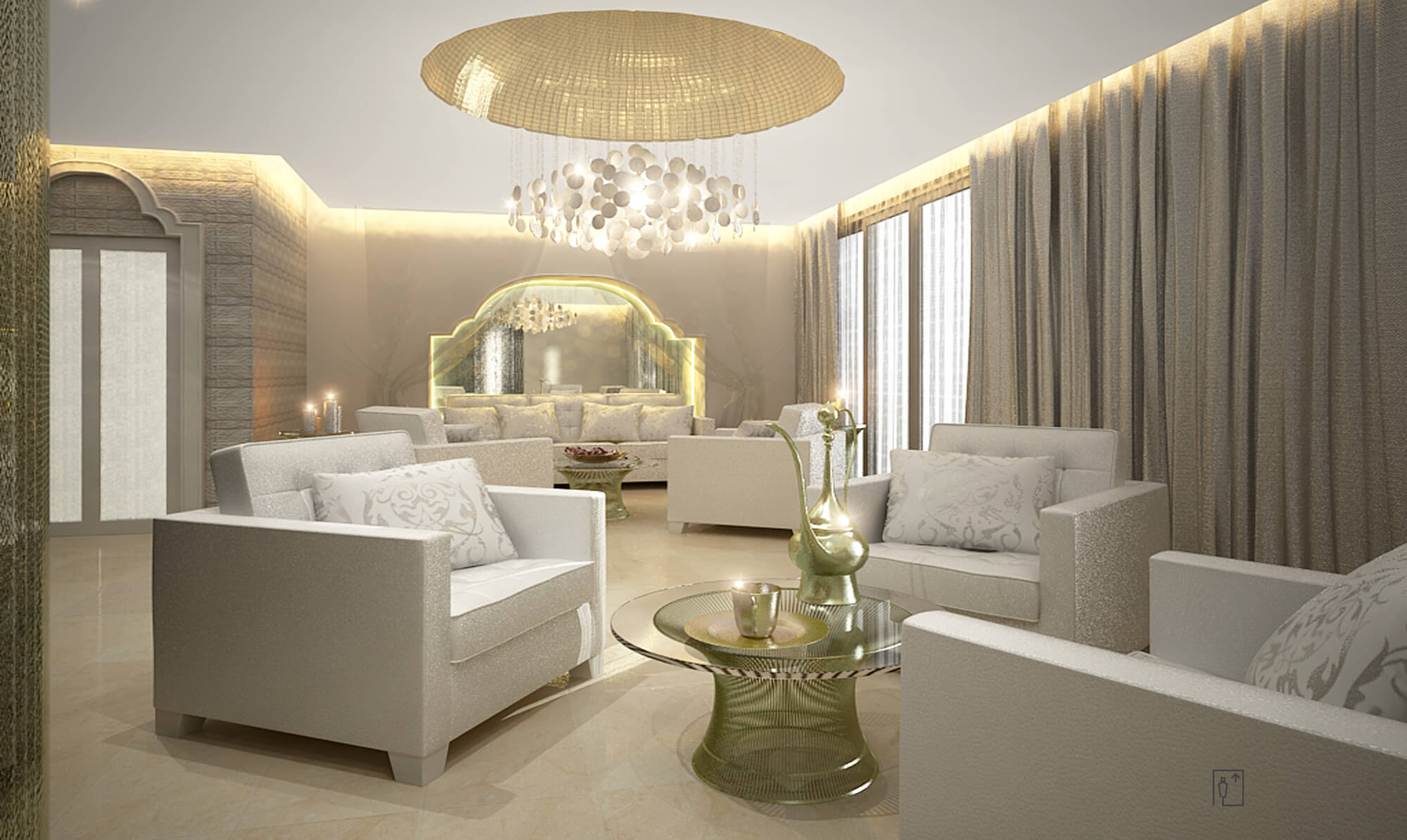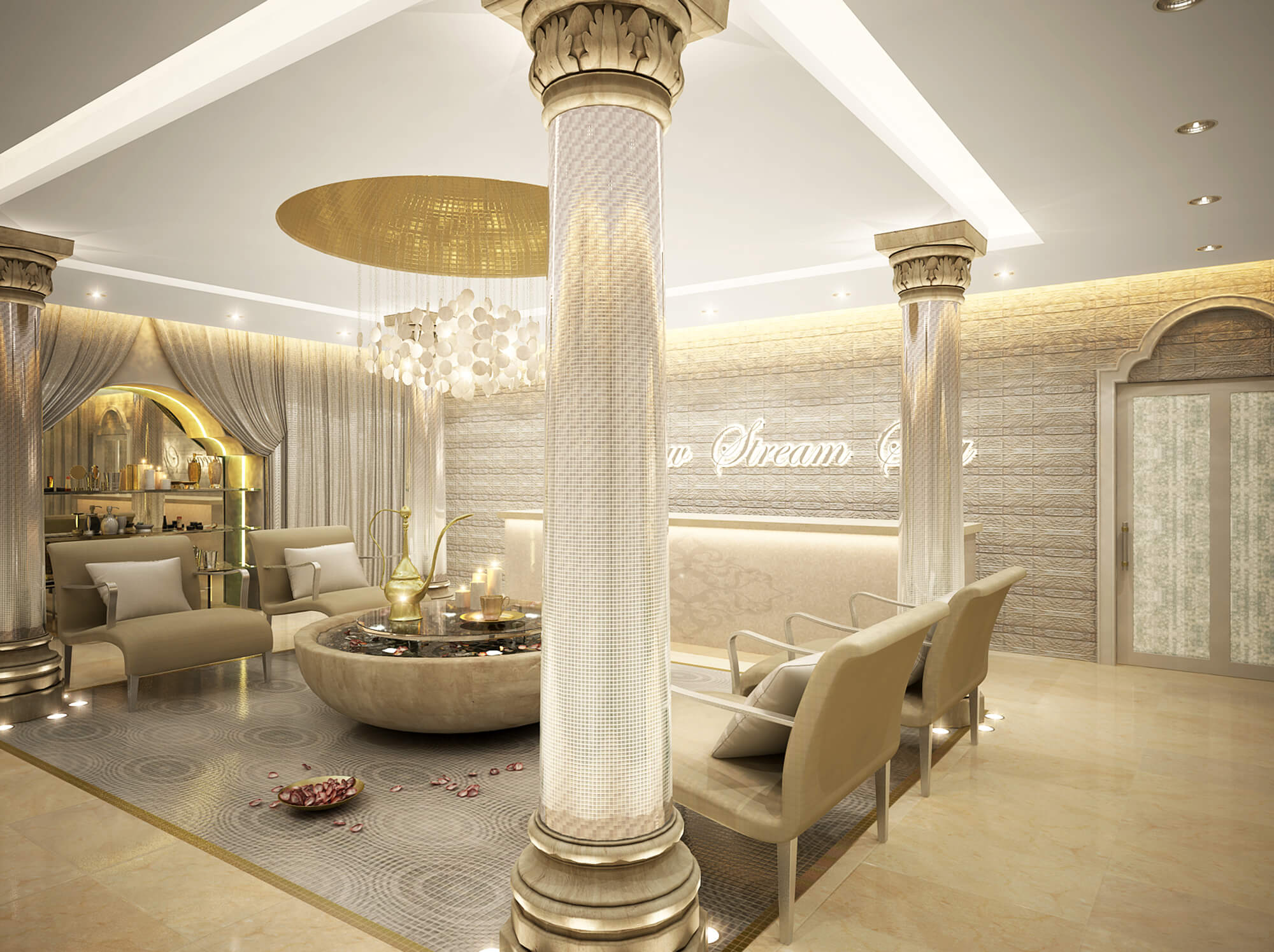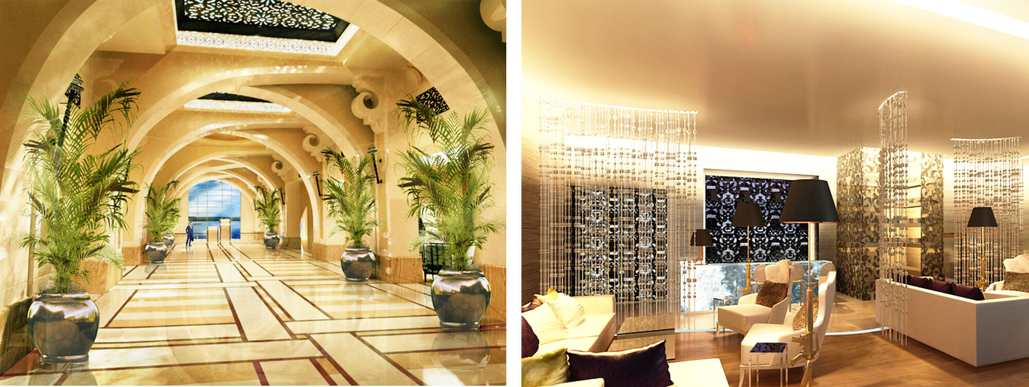 The hotel feels elegant and luxurious, with creamy marble and a sand-meets-sea palette of beige, tan and aquamarine. Mashrabiya woodwork, brass lanterns and grand arches create a contemporary Arabian look.