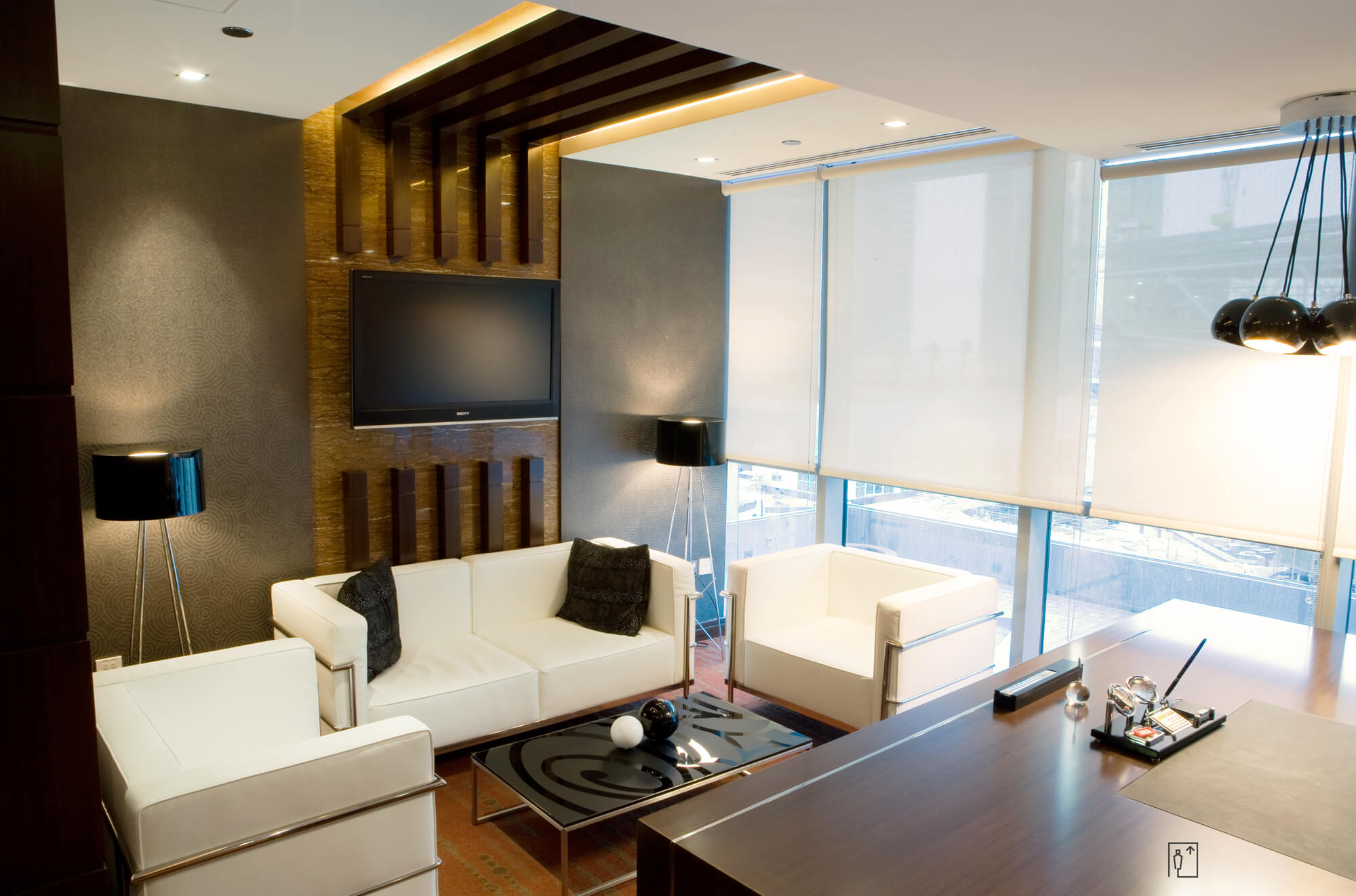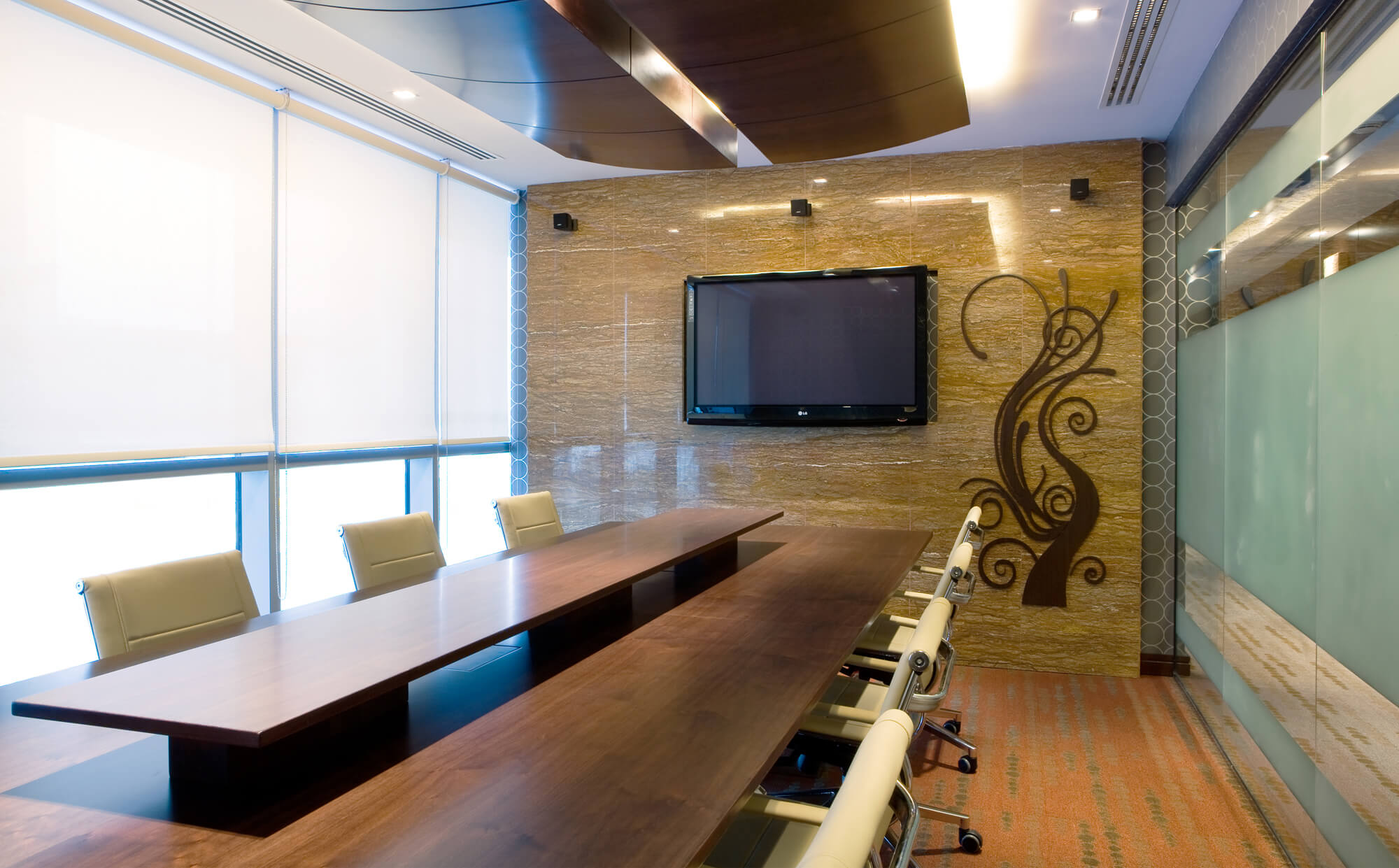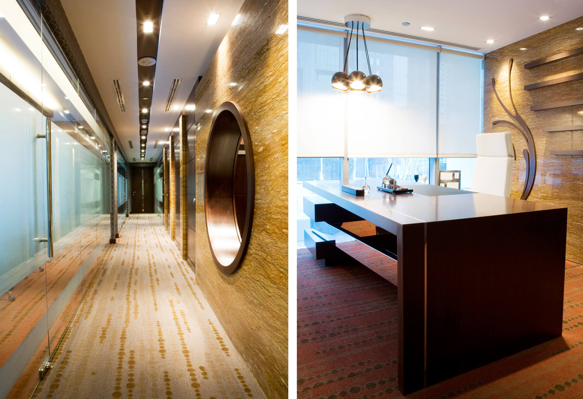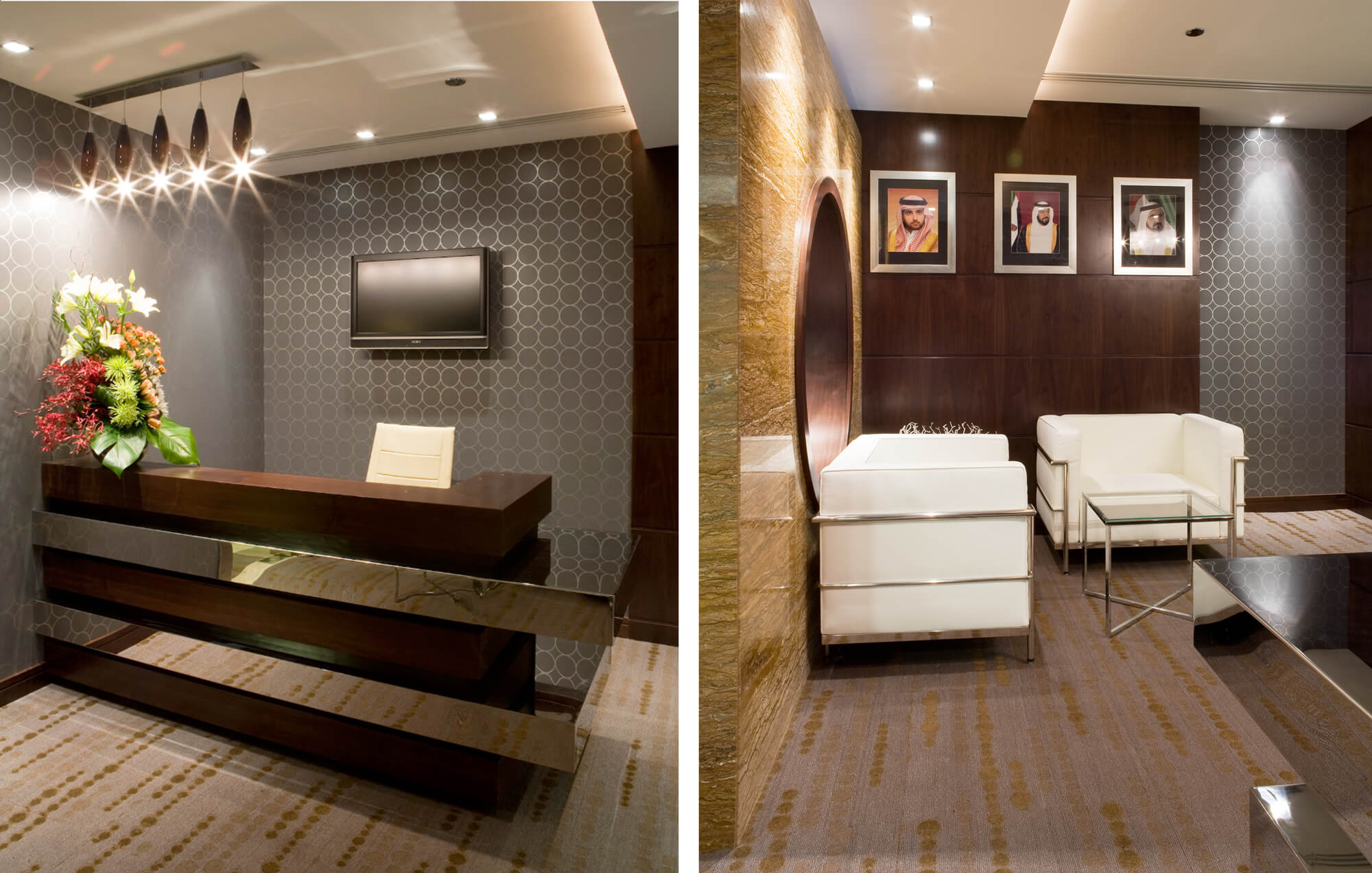 This executive suite of corporate offices located in the iconic Indigo Tower development in Jumeirah Lake Towers, takes the corporate ethos of fine tailored office interiors to the fullest options of fitted and finally crafted storage, audio-visual and display paneled elevation treatments.