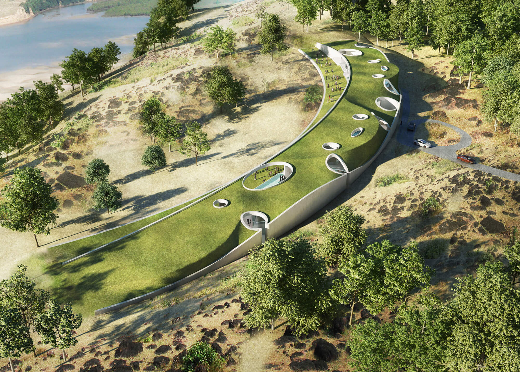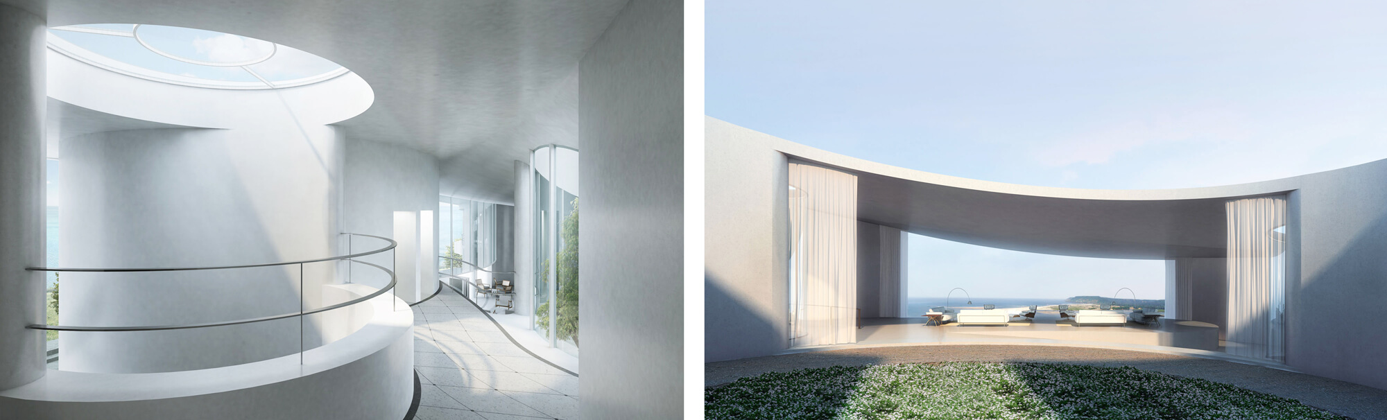 The wavelike plan allows a sequence of punctuated circular openings that bring light into the building and allow the use of greenery and pools of water. The bioclimatic design and the positioning of the building saves energy while the connection between the building and water creates a natural cooling system.