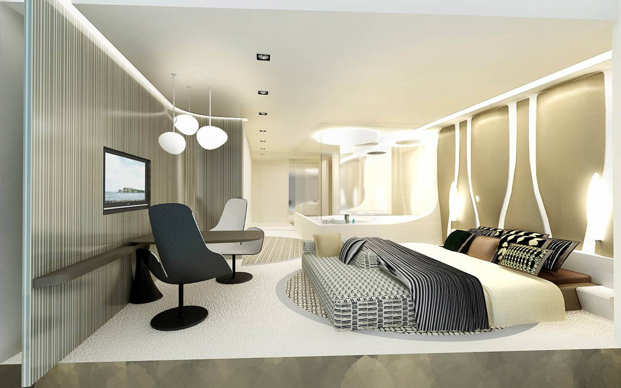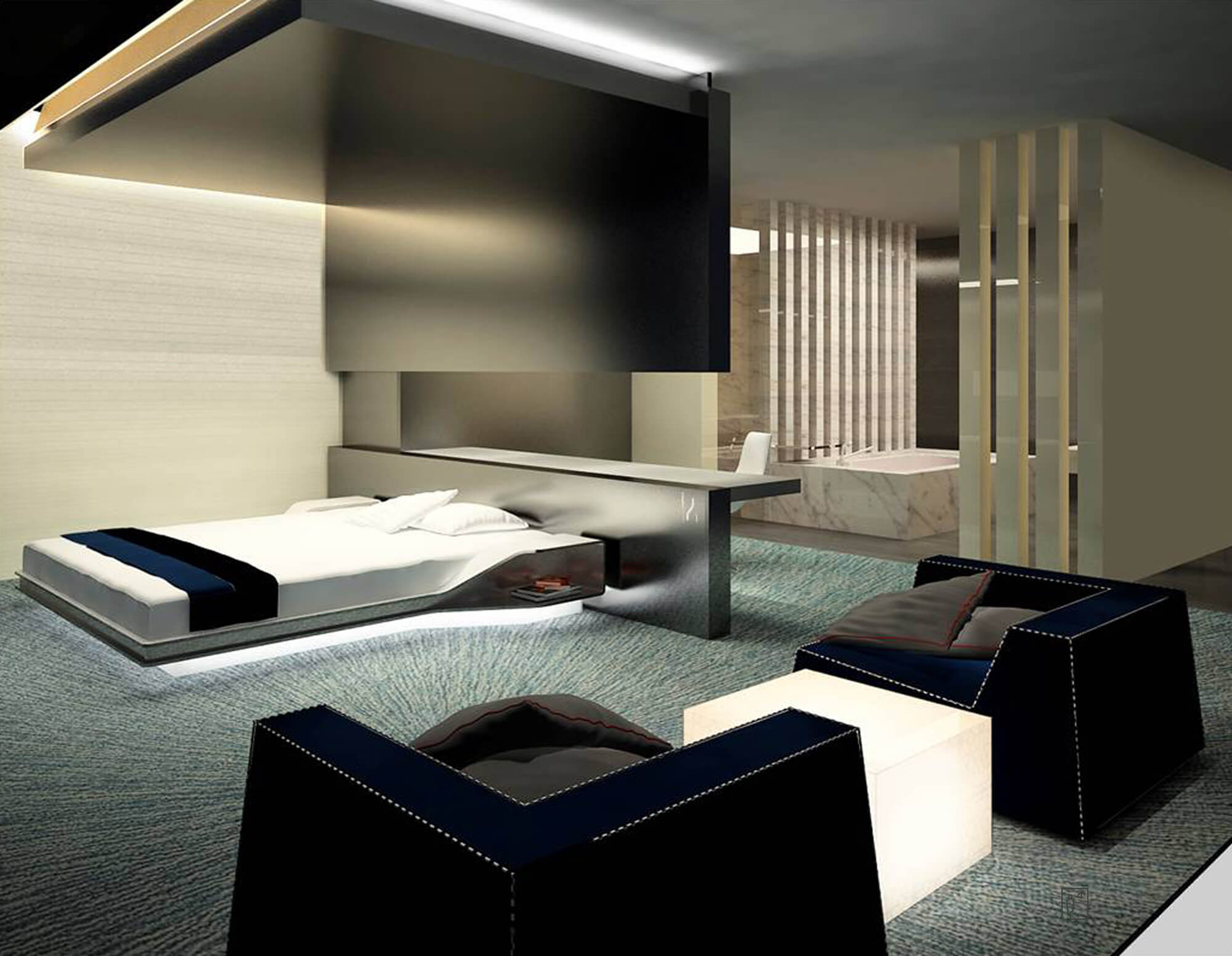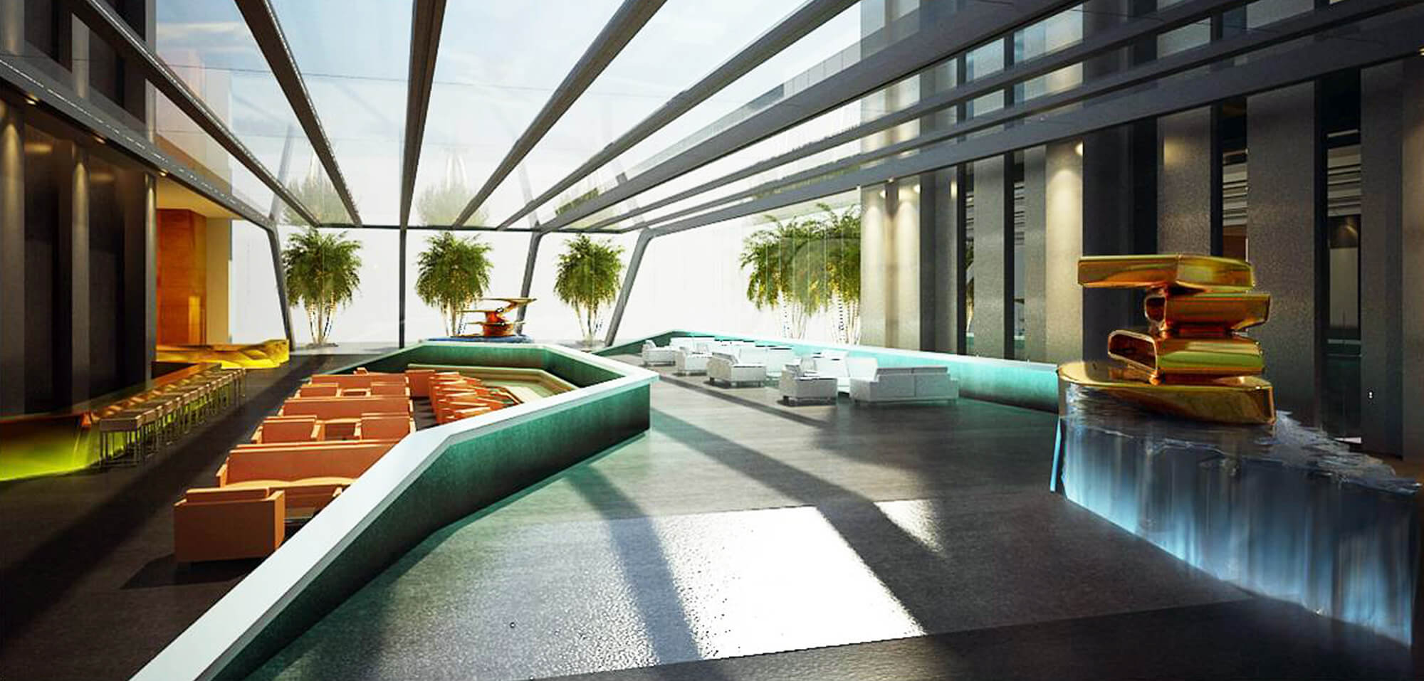 The interior design of the hotel is an interpretation of the architectural characteristics that accentuates dynamic volumes and spatial range offering a totally futuristic impression.