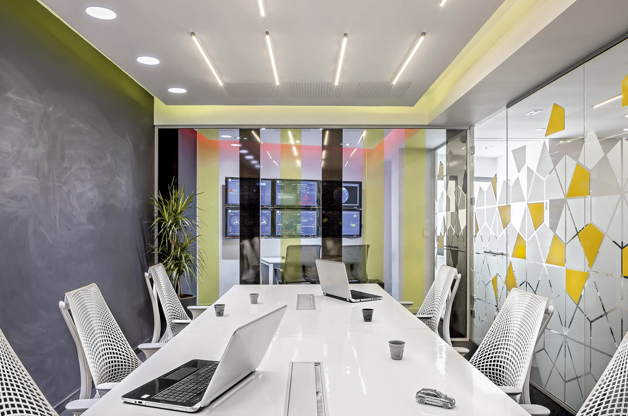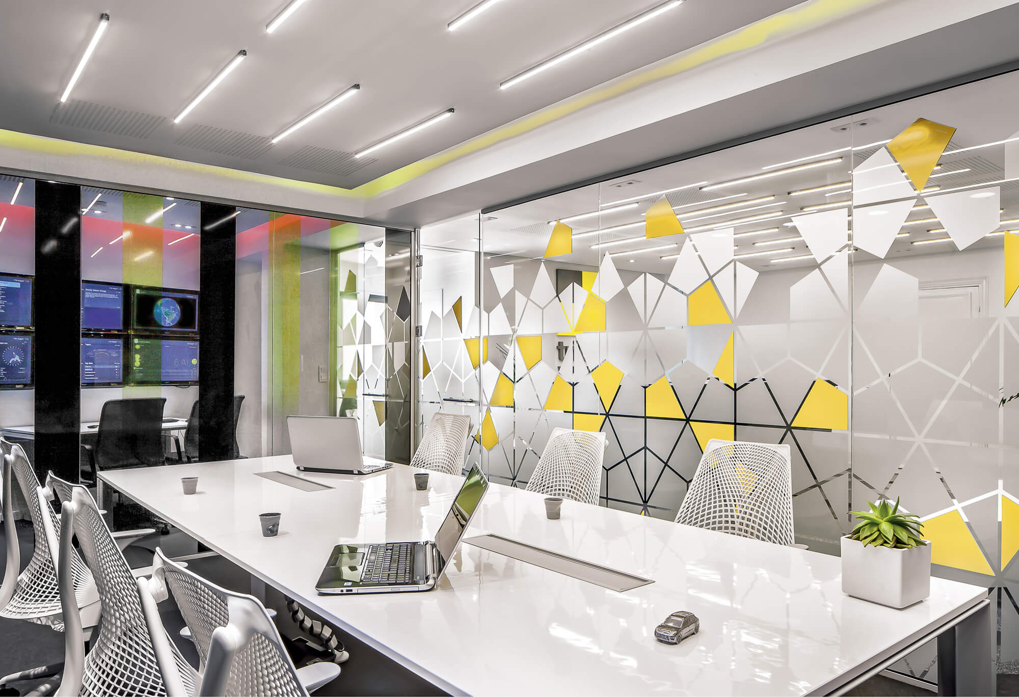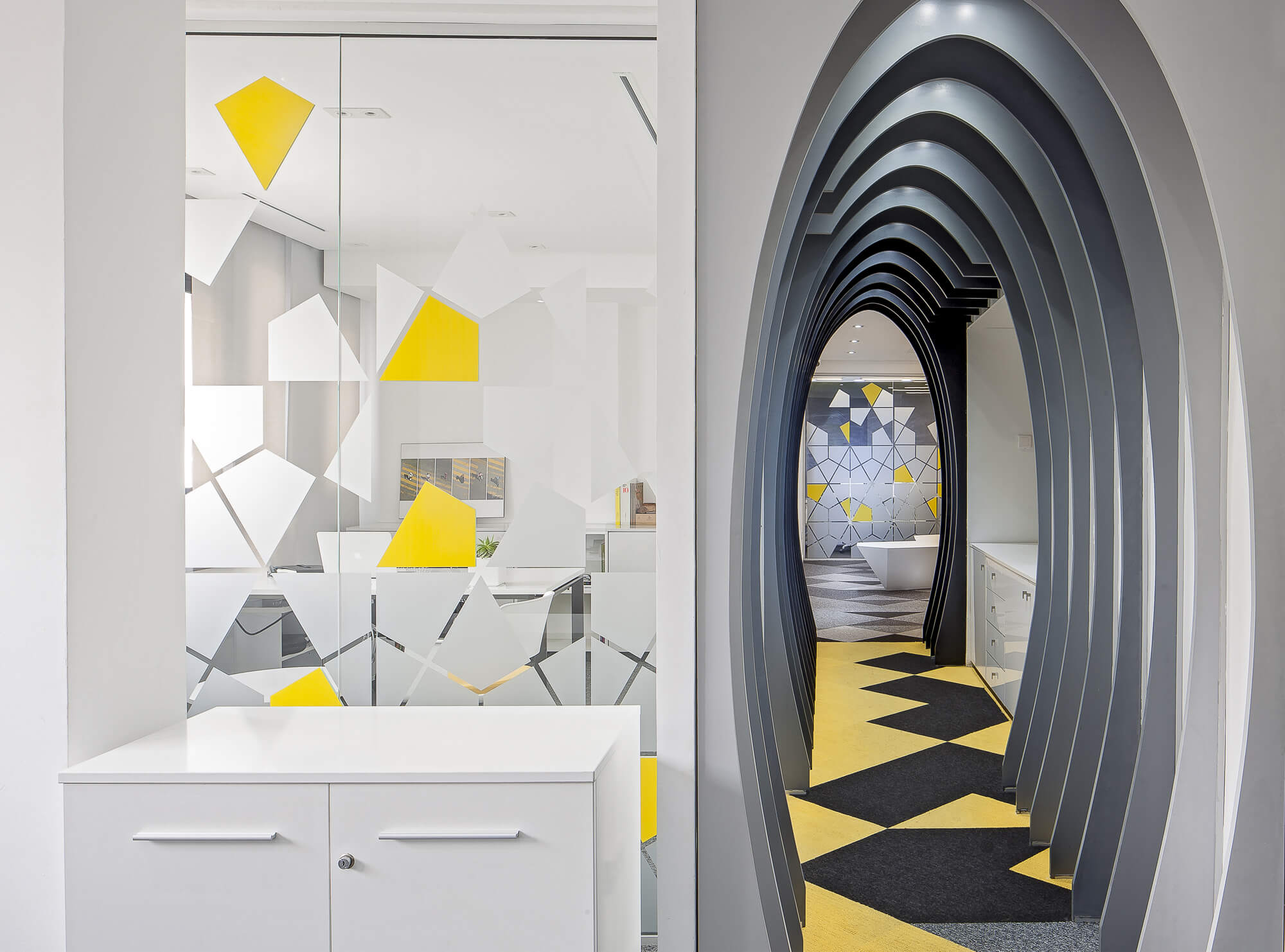 The company's logo provided inspiration for the interior and graphic design. Splayed across the glass partitions, the flooring pattern and lines of the reception counter and furniture are graphics pulled from a triangular futurist thread with a dominance of grey and a touch of corporate yellow, giving the office a unique personality. The layout of the office was configured in a way that would provide clearly separate public, meeting and office zones. A simple and clean flow was achieved between these separate areas by a futuristic vortex. Collaborative breakout areas and informal meeting and social areas were also integrated. With this design, Tribal DDB have gained an office that truly reflects the company brand as well as provides an engaging workspace for staff.